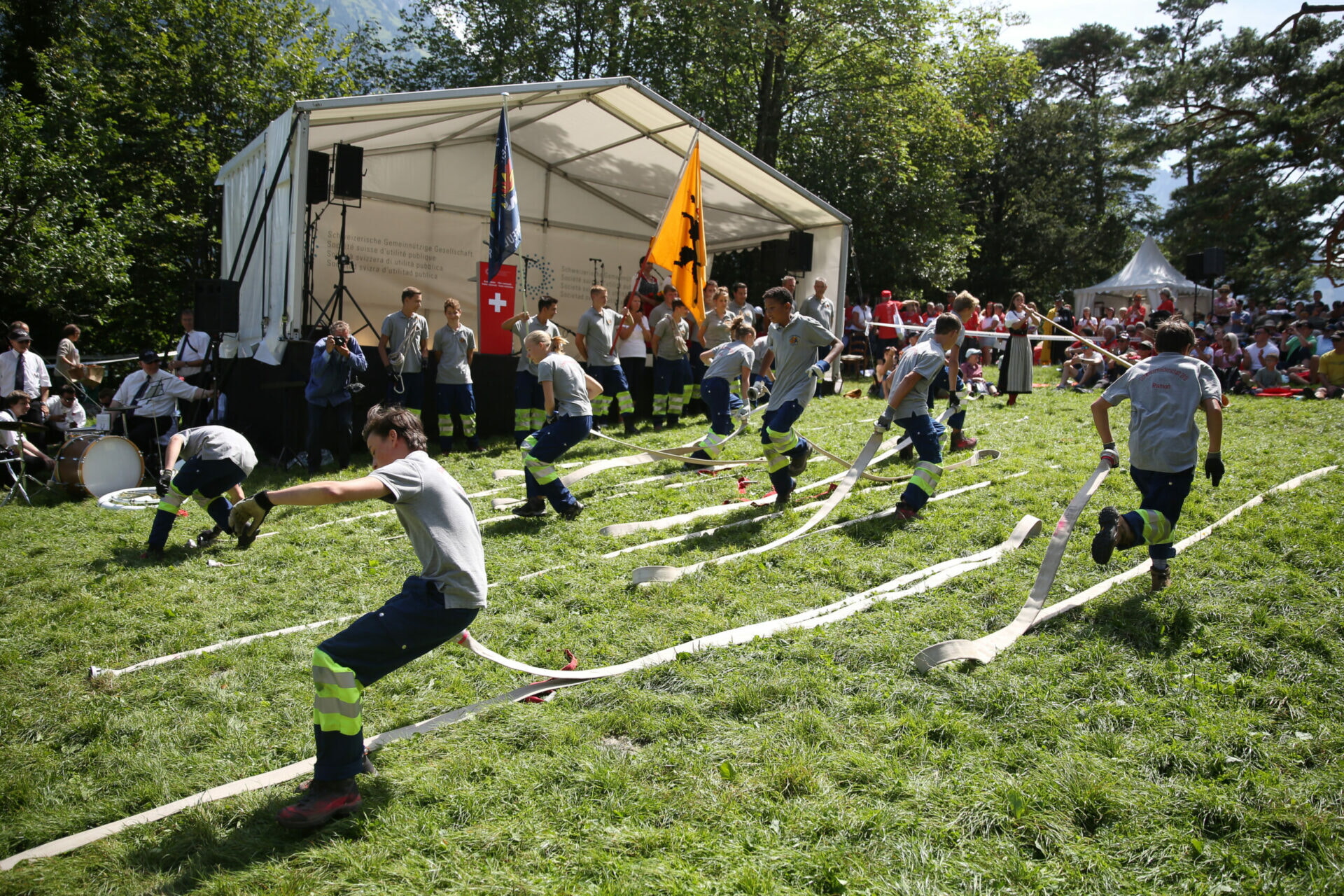 The leitmotif for this year’s National Day celebrations was militia work as a commitment to society. For this reason, the SGG invited the Swiss Municipalities Association (SGV) with around 200 municipal representatives to the cradle of the Swiss Confederation. The Association has launched a “Year of Militia Work”. And the Swiss Fire Brigade Association, which celebrates its 150th anniversary, mobilized around 700 fire-fighters on the Rütli. Hannes Germann, President of the Swiss Municipalities Association and a member of the Council of States from Schaffhausen, stressed that militia work opens up new horizons in politics and social organizations. According to Laurent Wehrli, President of the Fire Brigade Association and National Councillor from Vaud, the militia system offers everyone an opportunity to use their skills and abilities for the good of society but also demands sacrifices, not least from families. In her speech, Heidi Z’graggen, member of the cantonal government of Uri, also addressed the topic of militia work and discussed possible incentive schemes to promote this state commitment: compensation, tax relief or recognition of militia work as further training. Carmelia Maissen, Mayor of Ilanz, pointed out the importance of militia work, especially in rural areas, where there are fewer professionally linked structures than in towns and cities. But the National Day celebrations owed much of their appeal not only to the speeches but also to the lively musical and scenic elements. Lisa Stoll’s performance on the alphorn and the troupe of young flag-swingers from Weggis were no less impressive than the Amriswil project choir and the children who performed the play “Tell – quick and cheeky” by comedian Florian Rexer. As in the previous three years, after singing the Swiss Psalm, participants joined in a rendition of the proposed new text, “White Cross on Red Ground”, to the traditional melody of the Swiss national anthem. The Rütli leaseholder’s team served up delicious helpings of bratwurst, potato salad and vegetable balls before the 2000 guests made their way back to their homes in all parts of the country to be part of celebrations going on well into the evening.