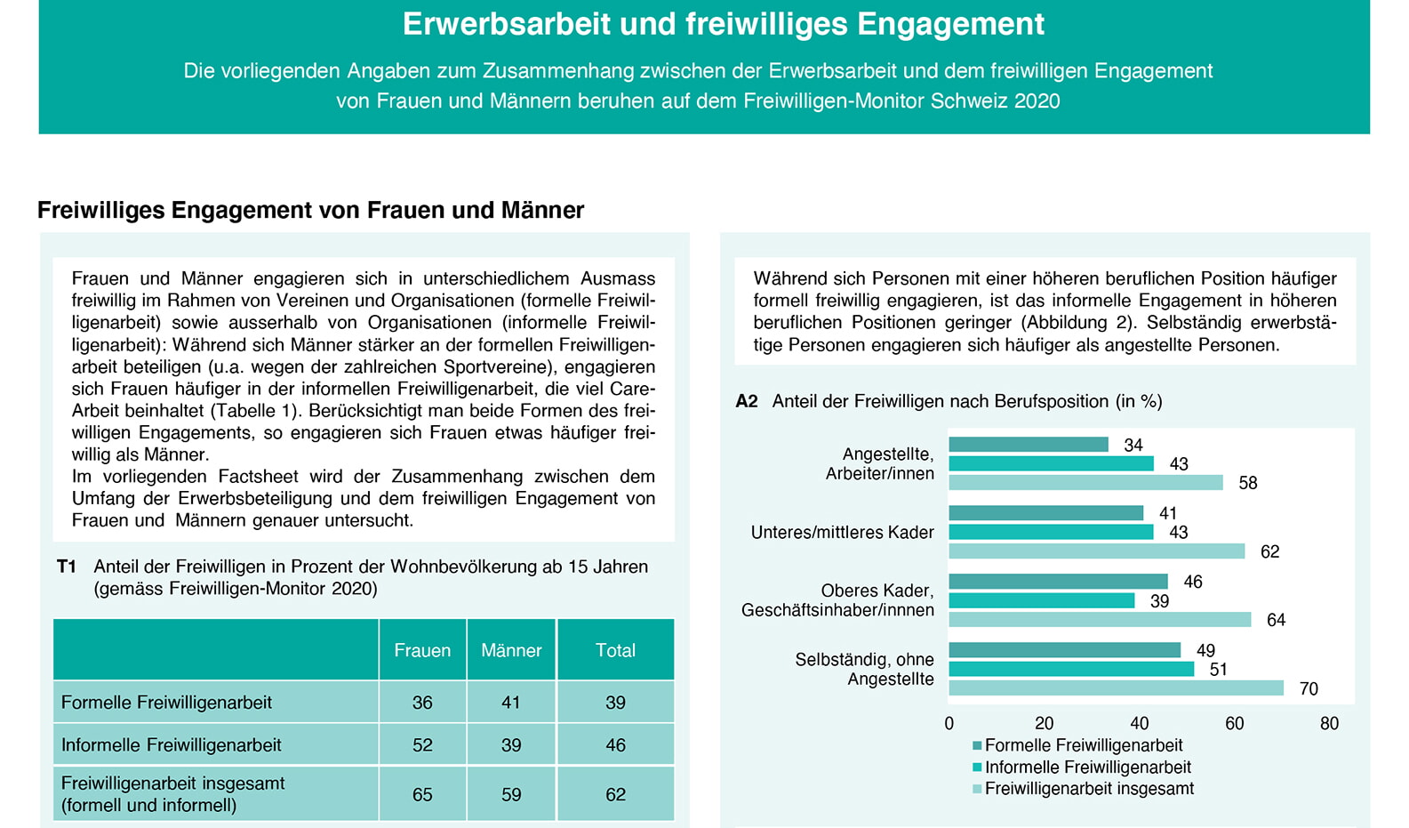 Zahlreiche Factsheets und Zusatzanalysen informieren auf je 2-4 Seiten Detailanalysen über die zahlenmässige Entwicklung der Freiwilligenarbeit bezüglich Geschlecht, Alter, Sprachregion, Siedlungstyp, Nationalität, Haushaltseinkommen, Arbeitsaufwand, Entschädigung und Motive. Sämtliche Factsheets können auf der Webseite des Freiwilligen-Monitors kostenlos heruntergeladen werden: Factsheets zum Freiwilligen-Monitor 2020