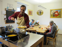 Wenn SeitenWechsler im Einsatz sind, werden diese wie Angehörige zum Thema Demenz geschult. Dann begru?ssen sie um 10 Uhr die ankommenden Gäste, bringen ihnen Kaffee oder leiten zum Kaffeeholen an. Da kann es vorkommen, dass ein SeitenWechsler Karin Beyeler meldet, Frau X habe ihren Kaffee selbst geholt wo sie es doch nicht mehr konnte. Karin Beyeler schätzt dies: «SeitenWechsler haben einen frischen Blick im Umgang mit unseren Gästen.» Turnen und Ru?sten fu?r das Mittagessen ist danach Programm fu?r alle. Die Fu?hrungskräfte essen, wie die Betreuenden auch, mit den Tagesgästen zu Mittag. Das bedeutet, wahrzunehmen, wie sich die Einschränkungen auswirken und dann die Menschen zu unterstu?tzen: ihnen immer wieder die Gabel in die Hand geben, immer wieder «en Guete» sagen gehört zum Beispiel dazu, damit sie die Situation erfassen, «aha, wir sind am Essen». Nachmittags geht es dann täglich auf eine kleine Exkursion.